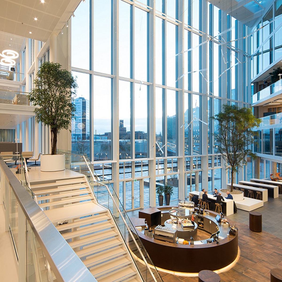 Centraal in het ontwerp van het gebouw, het interieur en de dienstverlening staan de gebruikersbehoeften. R Creators heeft zich hierin grondig verdiept en dat vertaald naar een integraal ontwerp. Gebouw, interieur en dienstverlening zijn geen losse elementen, maar versterken elkaar. Zo verleiden we bezoekers om naar Rijkskantoor De Knoop te komen. Bij de ontwerpoplossingen is niet gekeken naar de initiële kosten, maar naar de totale kosten over twintig jaar.