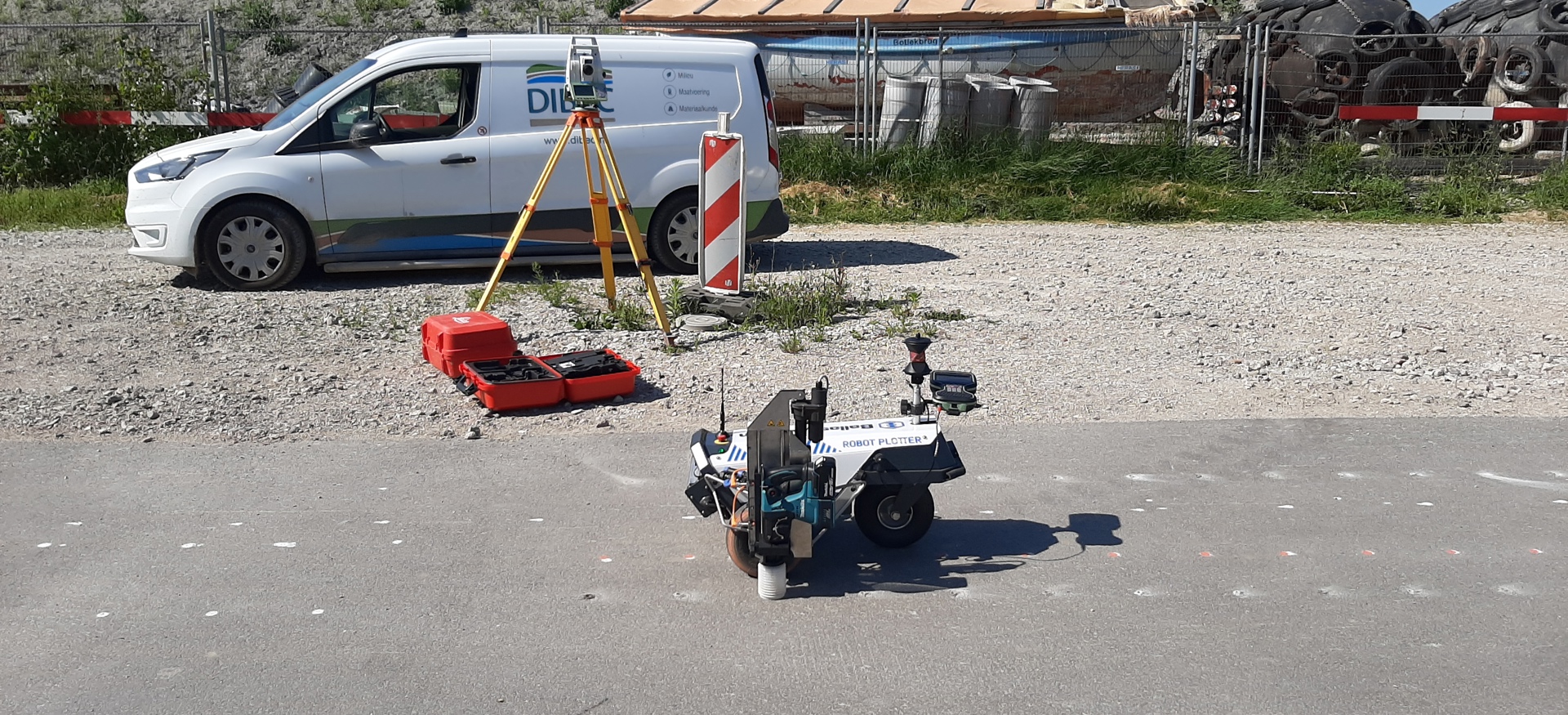 Wanneer alle posities van de boorgaten kloppen, markeren we de locaties van de gaten op de drooggelegde betonvloer van de compartimenten. Hiervoor halen we onze Robotplotter van stal. Dit is een elektrisch aangedreven robot die lijnen en punten kan uitzetten. De robot wordt aangestuurd door GPS of Total Station, afhankelijk van nauwkeurigheden en de omgeving. Op de A24 Blankenburgverbinding wordt het systeem aangestuurd met Total Station, zodat we de hoogst mogelijke nauwkeurigheid behalen.