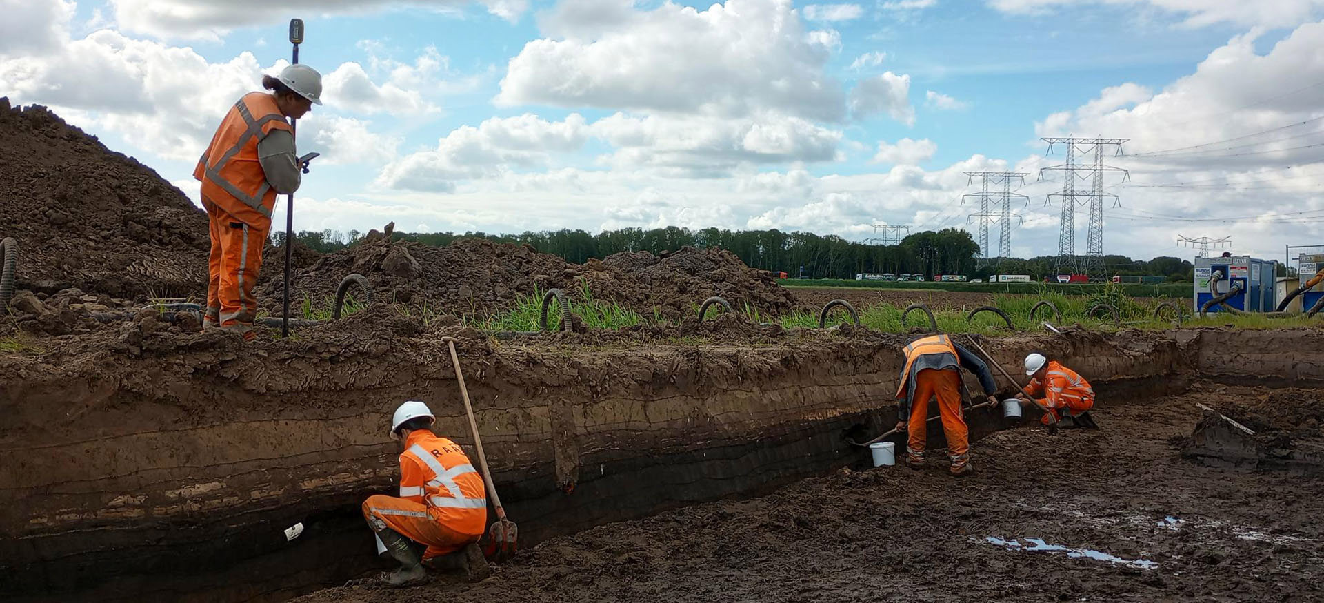 "We starten altijd met archeologisch bureauonderzoek waarin we inventariseren welke onderzoeken in de omgeving al zijn gedaan, hoe het landschap eruitziet en wat we aan archeologie verwachten. Dit onderzoek heeft Rijkswaterstaat al opgestart in 2019 en leidde tot een archeologische verwachting van het hele tracé. Langs dit tracé zijn duizenden archeologische boringen uitgezet die 3 tot 4 meter diep gaan, tot bodemlagen die in 4000-6000 voor Christus aan het oppervlak lagen. Zo brengen we de opbouw van de grond in beeld en kunnen we zien of er een kansrijke archeologische laag in de grond zit."