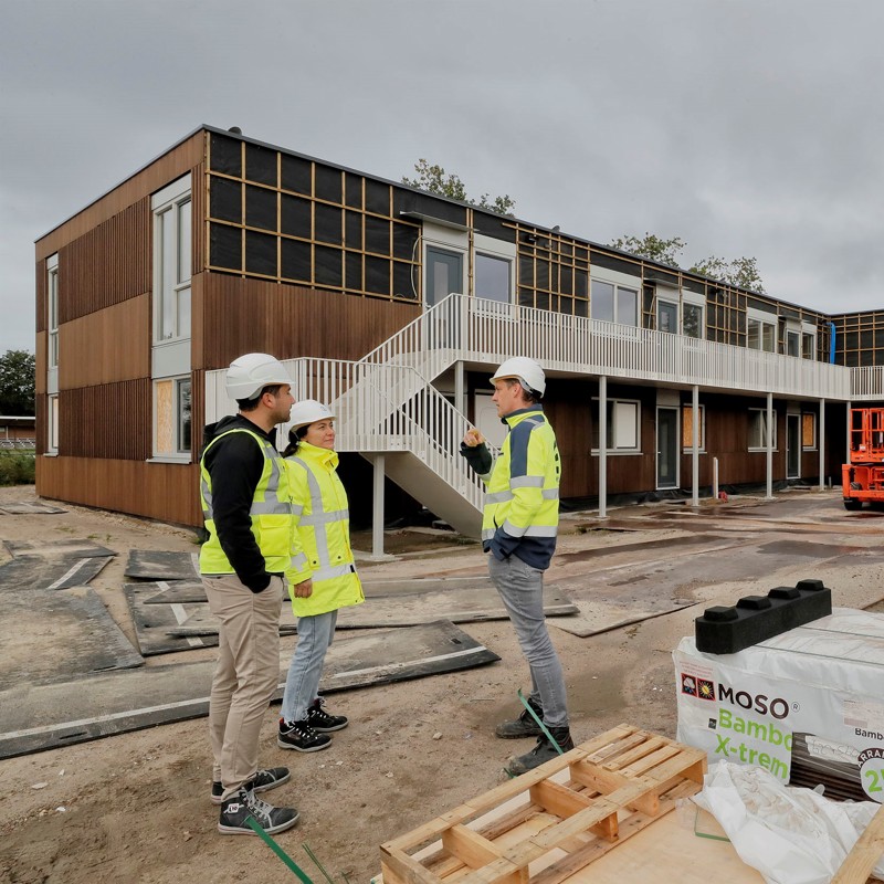 Voor Boaz valt Wooncompagnie onder de noemer ‘ultieme klant’. “Peter kende ons product en is er zelf mee gaan puzzelen voor een nieuw project. Hij informeerde daarbij naar nieuwe mogelijkheden, zoals de toevoeging van een grote bamboegevel. Wij hebben daar naar gekeken en het bleek mogelijk te zijn. Het is een duurzame oplossing, want bamboe is biobased materiaal. Het groeit namelijk weer terug, dus je onttrekt geen grondstoffen aan de planeet. Sowieso proberen wij ons product zo duurzaam mogelijk te produceren: 75% van onze modules bestaat uit hout. Daarnaast is het project zelf ‘all electric’, met warmtepompen en zonnepanelen voor de energieopwekking. Een volgende stap die we willen zetten is de verduurzaming van het isolatiemateriaal. Daar hopen we biobased grondstoffen als lisdodde en vlas voor te gaan gebruiken.” Zo draagt industrieel, modulair bouwen bij aan de verduurzaming van de gebouwde omgeving. Maar het levert natuurlijk ook een bijdrage aan een ander groot maatschappelijk probleem: het woningtekort.