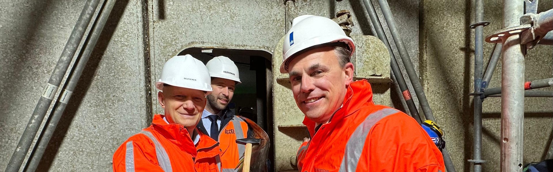 Als eersten klopten burgemeester Bert Wijbenga en wethouder Bart Bikkers met een speciale herinneringshamer op de zware deur die dit stukje tunnel tijdens de bouw moest beschermen tegen de waterdruk van het Scheur. Even later was het de beurt aan wethouder Vincent Karremans van Rotterdam en dorpsraadvoorzitter Rob Oosterlee van Rozenburg.