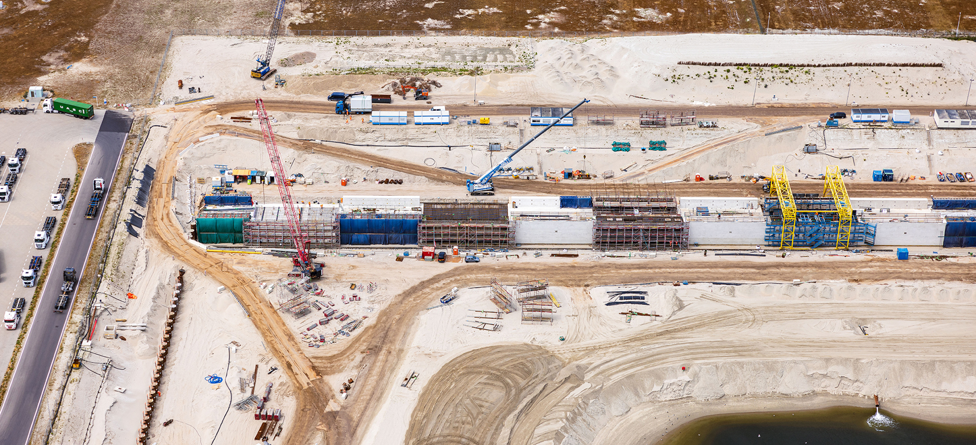 Bij een megaproject als de Prinses Amaliahaven – waar veel logistieke stromen bij elkaar komen en ook nog eens aan het water ligt – krijgt veiligheid extra nadruk. Al in de aanbestedingsfase werkten we een conceptueel plan uit waarbij we de vervoersstromen via land en water scheiden. En waarbij we op bepaalde momenten van de dag helemaal geen materialen aanvoeren. Hiermee garanderen we verkeersveiligheid: zowel over land als over water. Na het winnen van de aanbesteding scherpten we de maatregelen nog verder aan. Zo zijn er aparte toegangswegen voor personen- en bouwverkeer, is er langs de bouwweg een apart looppad, worden de bouwwegen overzichtelijk ingericht én hanteren we verkeersregels voor bouwverkeer. Bovendien sturen we met prestatie-indicatoren op nette en overzichtelijke werklocaties. Op die manier zorgen we voor een veilige werkomgeving, bij een plek waar we werken aan de toekomst.