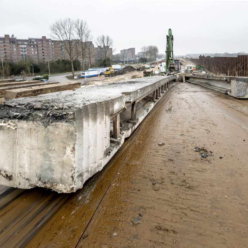 En zo geschiedde: in februari werden zes liggers van het viaduct veiliggesteld. Een bijzondere dag, vertelt Rien Bakker: “Zeker als ingenieursbureau is het niet gebruikelijk om zes liggers in eigen beheer te krijgen. We hebben ze na het uithijsen een aantal weken veiliggesteld op een terrein, terwijl we afwachtten of we tot de laatste drie partijen in de Strategic Business Innovation Research van Rijkswaterstaat behoorden. Nu dat inderdaad het geval is, kunnen we starten met het maken van het prototype.“