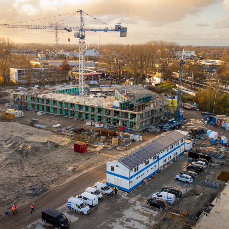 Gerard vertelt dat de meeste bouwplaatsen in het begin nog geen bouwstroom hebben en dat dan aggregaten worden gebruikt. “Die verbranden veel diesel en zijn behoorlijk vervuilend. Daarom hebben we op de bouwplaats in Zaandam een groot accupakket neergezet voor de stroomvoorziening. Ook hebben we 102 zonnepanelen geplaatst op het dak van een keet van 30 meter lang. Daarmee wekken we 20.000 kilowatt stroom per jaar op en kunnen we de bouwkeet en een deel van de bouwplaats van stroom voorzien. En het mooie is: het zijn tweedehands panelen van Marktplaats. Ze komen van een oude school en zouden anders weggegooid worden. Eigenlijk zijn deze zonnepanelen dus op twee manieren duurzaam.”