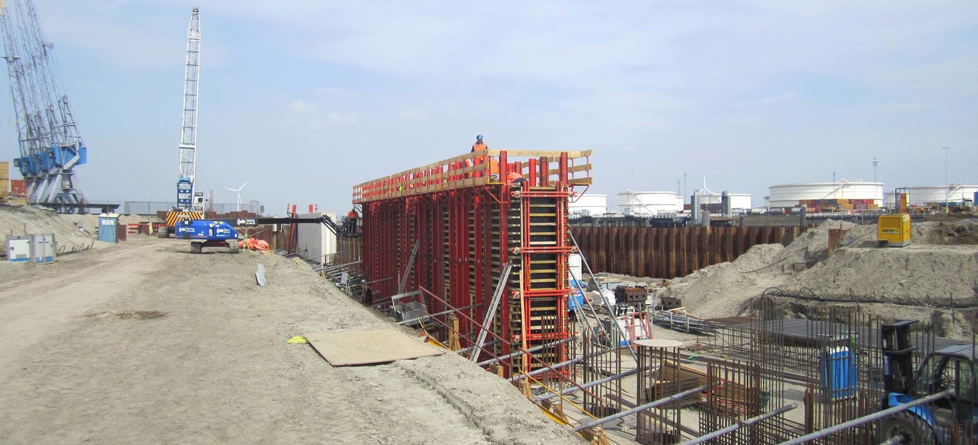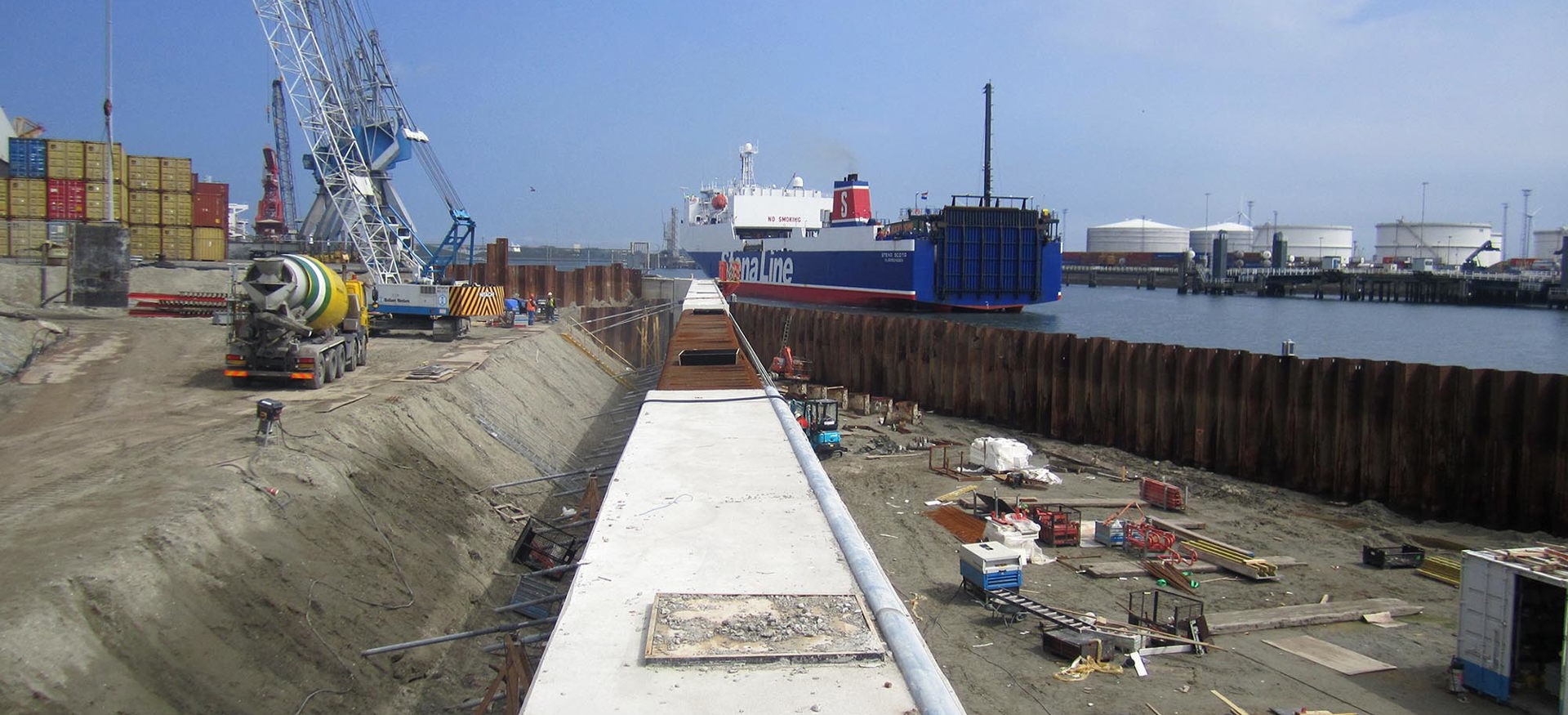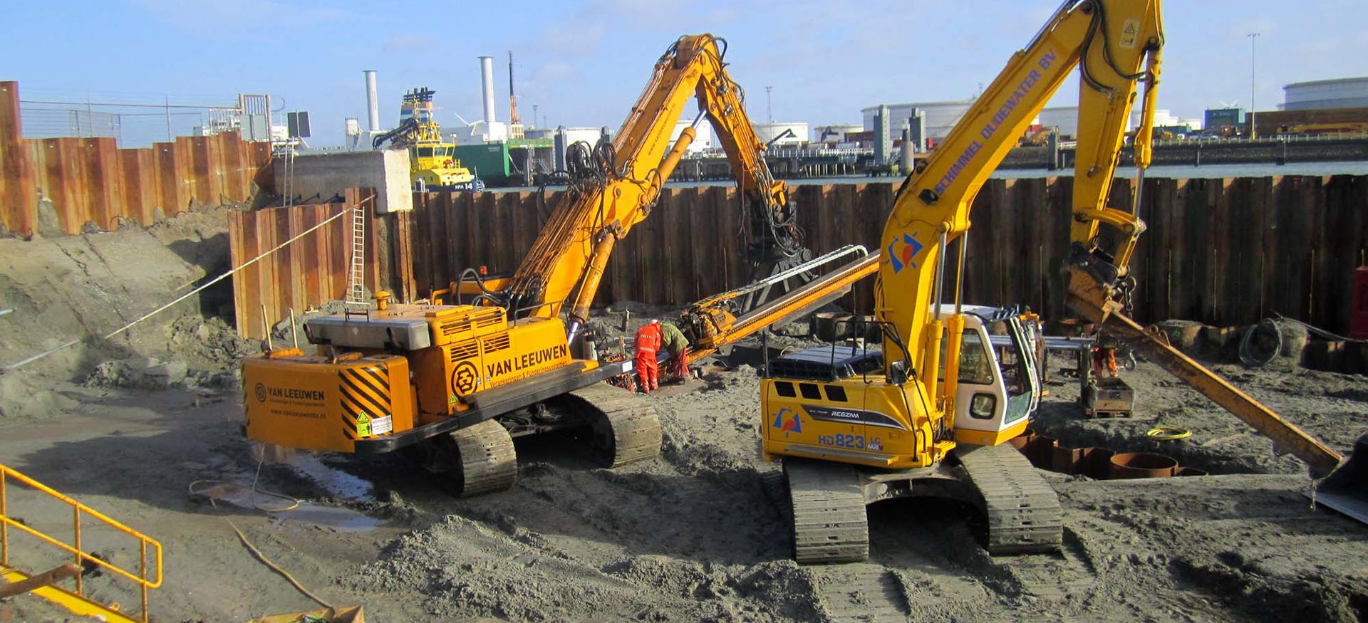 Onze werkzaamheden waren al in volle gang toen Havenbedrijf Rotterdam de opdracht uitbreidde. In goed overleg stopten we tijdelijk de werkzaamheden om zo de slimste werkwijze voor de aanvullende opdracht te bepalen. We besloten eerst de tweede RoRo-ligplaats te realiseren, die verder in de haven komt te liggen. Met die ligplaats creëeren we gelijk extra ruimte, zodat we de eerste ligplaats met minder hinder voor Stena Line kunnen aanpakken.